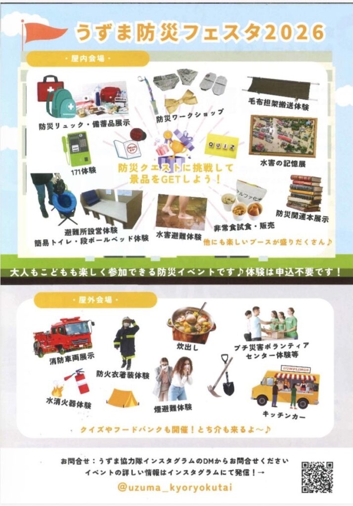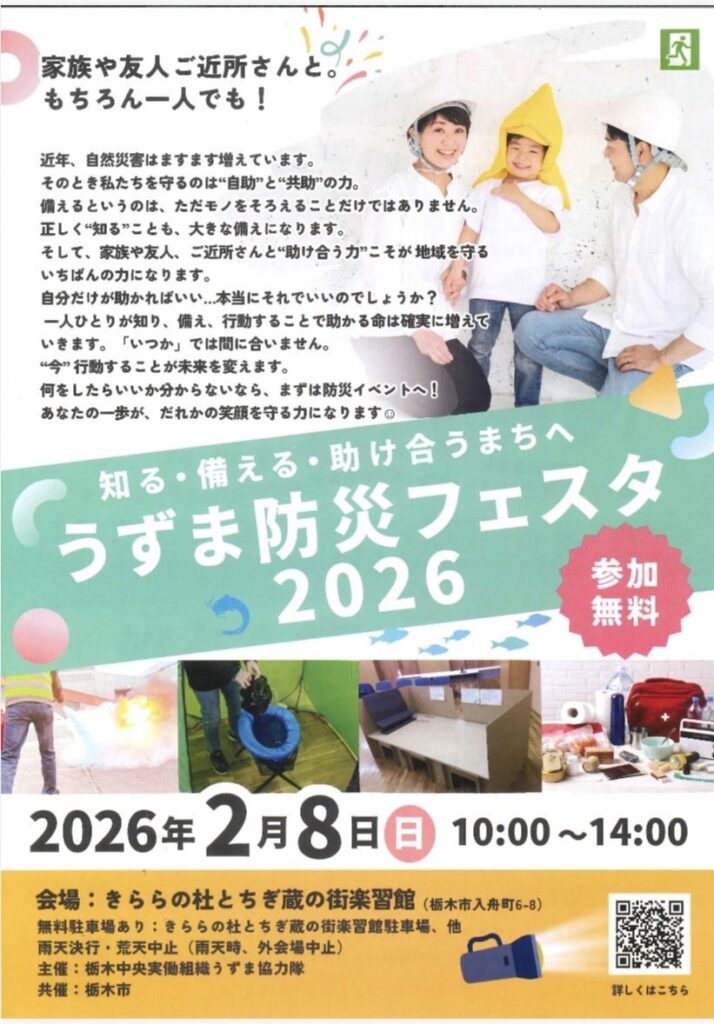 2月8日(日)に開催される『うずま防災フェスタ2026』に、栃木JCも出展します! 浸水や地震が起きたとき、「どう備えるか」「何ができるか」をテーマに、体験を交えた防災ブースを展開します。 また、過去の水害時にまちのために栃木JCがどのような活動を行ってきたのか、写真展示を通してご紹介します。 会場:蔵の街楽習館 4F 講義室皆さまのご来場をお待ちしています!